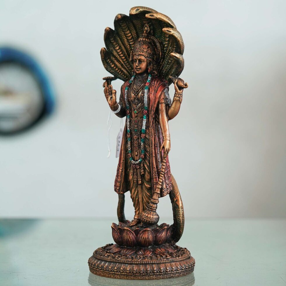 A Lord Vishnu idol is a sacred representation of the Hindu deity Vishnu, the preserver and protector of dharma (righteousness). He is often depicted in a standing posture, holding four symbolic objects: